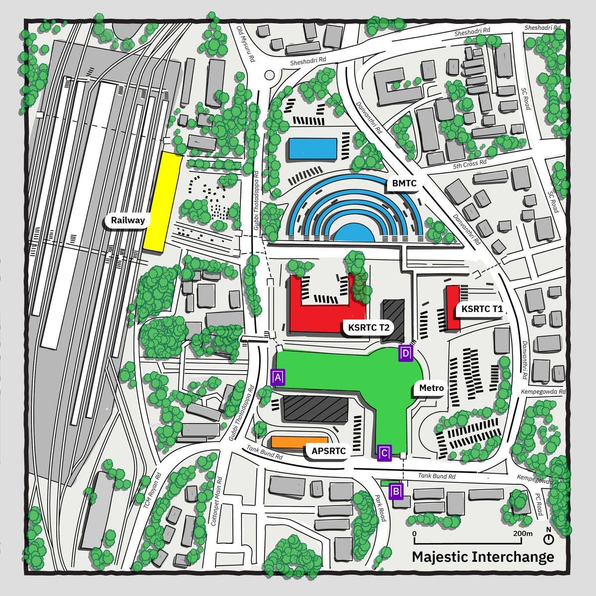 According to @bengawalk, this is where you access the Purple and Green lines, seamlessly switching between metro, BMTC, KSRTC, and Indian Railways. The present map doesn’t accurately represent all the footpaths, foot over bridges, subways. The same map varies across the different exits and landmarks at the station (yikes!).