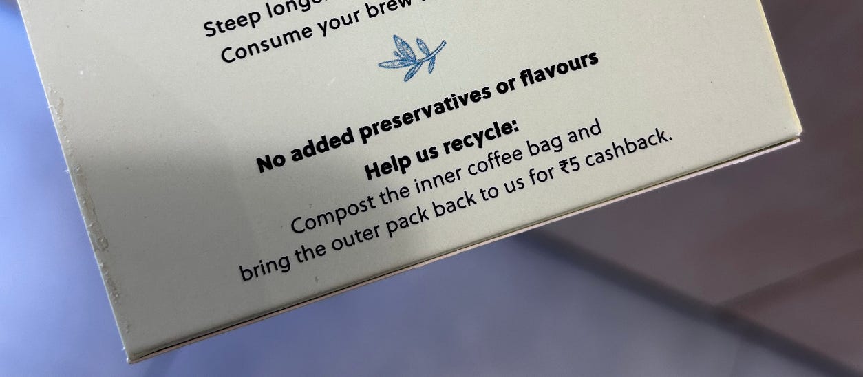 While at the Blue Tokai shop for my monthly refill of Vienna Roast, I stumbled on Blue Tokai’s cold brew range. It has brewing bags that can be composed and they’re offering to take the outer packaging back for recycling.